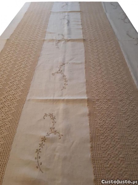 Toalha de mesa em linho grosso, com aplicação de renda de crochet e bordado.