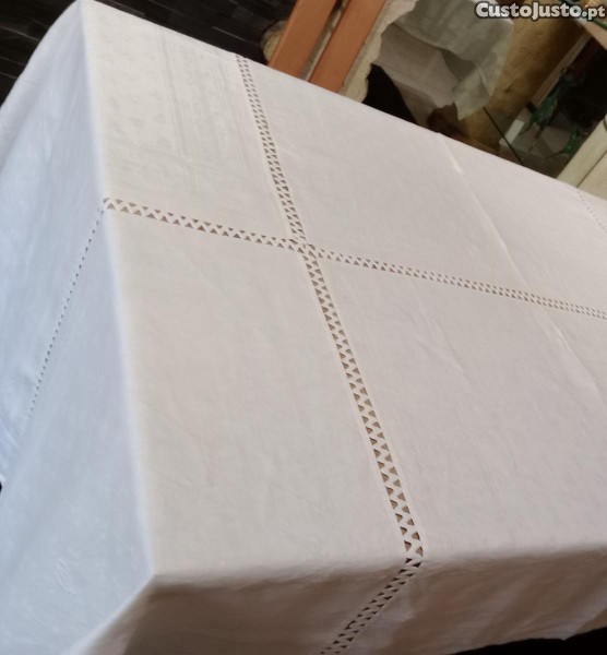 Toalha grande de mesa, secular, com entremeio formando grandes quadrados, tendo ainda bordadas à mão algumas rosetas, ao longo da toalha