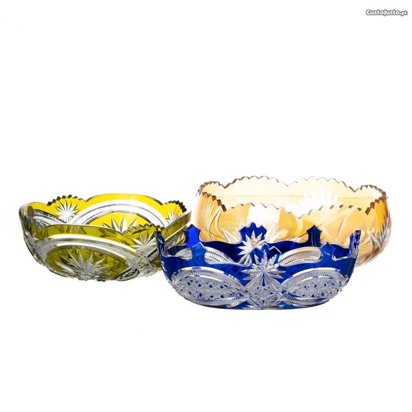 Três Fruteiros em cristal lapidado em doublé bicolor, de tons verde, amarelo e azul.