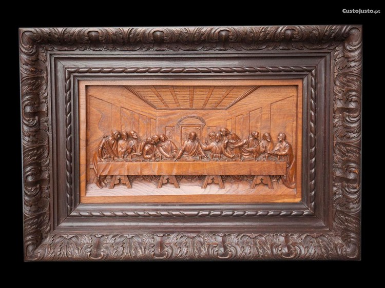 Última Ceia de Cristo em madeira de castanho maciço, entalhado, moldurado e patinado, do séc. XX.