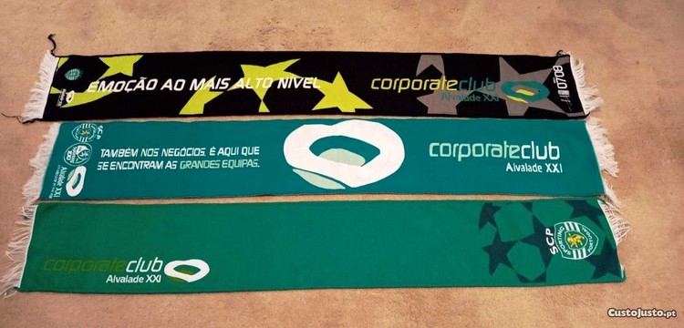 Três cachecóis diferentes Corporate Club Alvalade XXI -alusivos ao S.C.P.. Dois têm 130 cm e outro 140 cm. A altura de todos é de, aproximadamente, 20 cm. Em bom estado de conservação e estética, pois tiveram muito pouco ou nenhum uso.