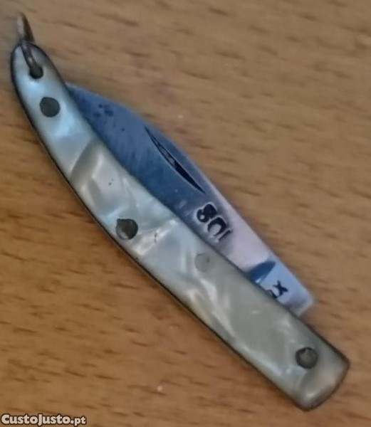 Canivete de bolso com punho em madrepérola, semi curvo, lâmina em inox, com o comprimento fechado de 5,6cm e quando totalmente aberto de 9,7cm.