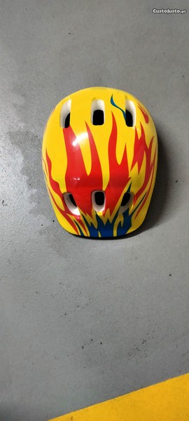 Capacete para criança até aos 8 anos. Serve para andar com Bicicleta, Patins, Skates, Trotinetes. Pouco uso, como novo. Prende com umas fitas ao pescoço. Se precisarem de joalherias e cotubuleiras também vendo pelo preço de 10.