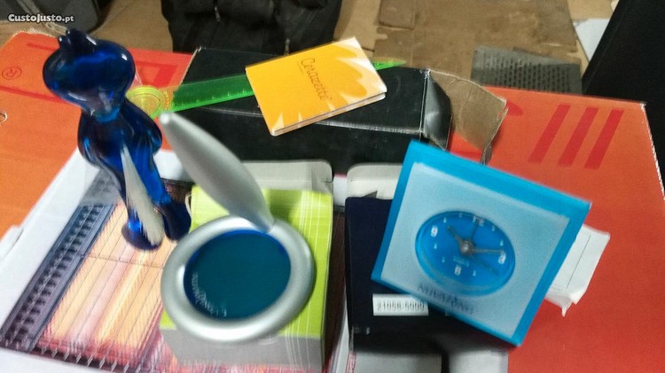 Relógio despertador, suporte e caneta, Limpa teclados, corta papel e mini bloco de apontamentos.