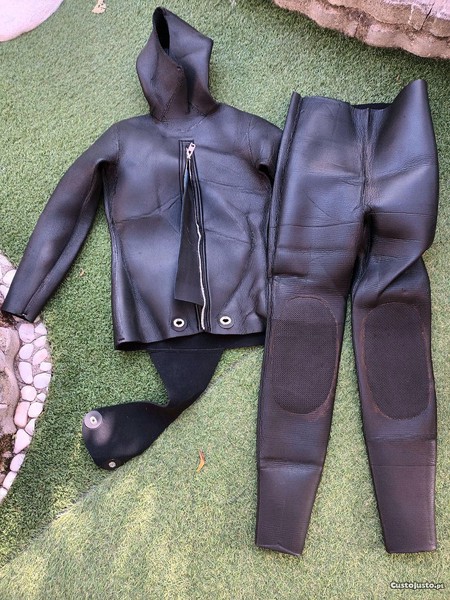 Fato caça submarina em borracha em estado como novo...muito bom para apanhar percebes devido a ser forte. Nao tem medida mencionada (talvez seja tamanho M para pessoa magra). Pode experimentar.