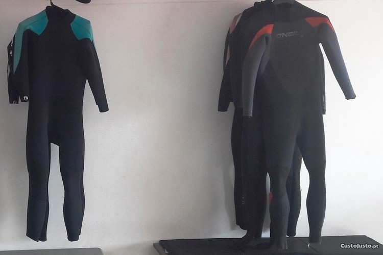 A Escola Surfaventura localizada na praia de Matosinhos tem para venda vários fatos de Surf da marca ONeill e outras de diversos tamanhos, modelos e espessuras.