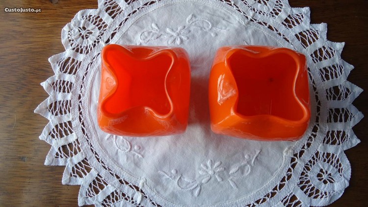 2 jarrinhas com mais de 100 anos em vidro (sopro) coalhado cor laranja. Podem servir para colocar velas, por exemplo.