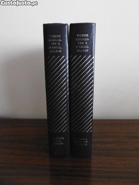 Dois volumes de uma obra literária de Pierre Souvestre e Marcel Allain, provavelmente relacionados à série "Fantômas "A Vespa Vermelha" e "O Enforcado de Londres"