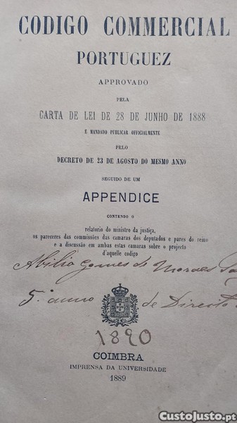 1 edição de 1889 desta edição, Código Commercial Portuguez aprovado pela carta de lei de 28 de Julho de 1888, e mandado publicar officialmente pelo decreto de 23 de Agosto do mesmo anno - Coimbra Imprensa da Universidade - 1889