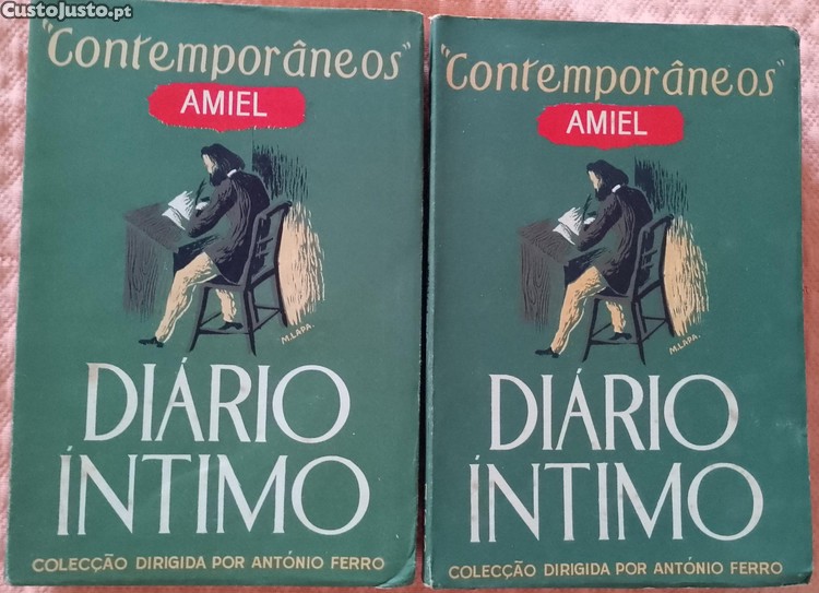 Diário íntimo, Henri-Frédéric Amiel (2 volumes), Livraria Tavares Martins, Colecção Contemporâneos Série B - Biografias e Memórias, colecção dirigida por António Ferro, 1944, 250+267 páginas. Com assinaturas de posse. Alguns pontos de acidez nas folhas e capas; em bom estado geral.