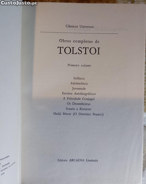 Infância/Adolescência/Juventude/Escritos Autobiográficos/A felicidade conjugal/Os Dezembristas/Sonata a Kreutzer/Hadji Murat (O demónio branco), Tolstoi, Editora Arcádia, Obras completas de Tolstoi - Primeiro volume, 1968, 841 páginas. Em bom estado.