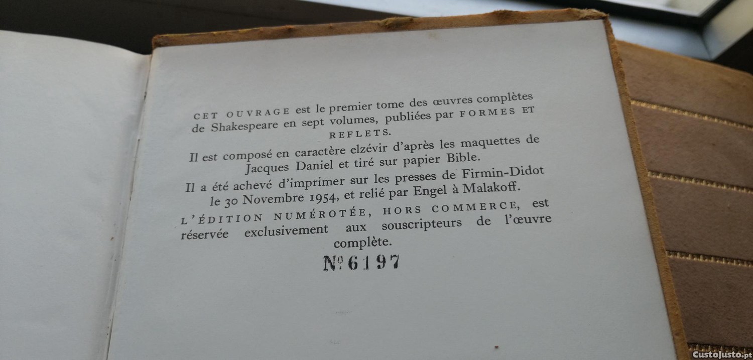 7 Volumes das muitas obras de Shaskapeare. Os volumes têm de 1400 a 1700 páginas. As folhas são em papel biblia sem defeitos. As capas são cartonadas, com algum desgaste nas lombadas mas com listagens douradas e unica em cada volume com marca Shakespeare.