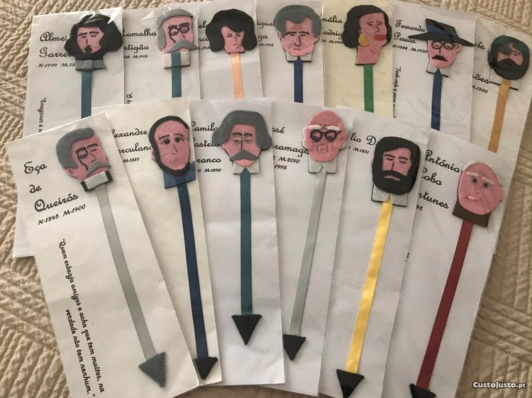 Coleção de 14 escritores /poetas portugueses, feitos em modo caricatura em feltro. Poderá adquirir só o marcador, ou com um valor simbólico de 1 euro, com uma pagela com as datas de nascimento e morte, se for o caso, assim como uma frase marcante do escritor..