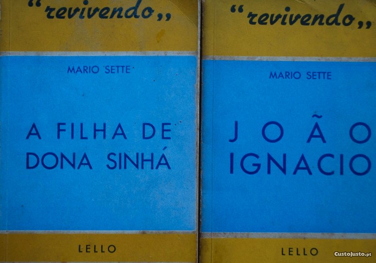 Título: João Ignácio Autor: Mário Sette Editora: Livraria Chardron, de Lello & Irmão, Lda Ano de Edição: 1928 Páginas: 184 Autor: Mário Rodrigues Sette, nasceu no Recife, 19 de abril de 1886 e faleceu a 25 de março de 1950. Foi um professor, jornalista, contista, cronista e romancista brasileiro. Outras Obras do Autor: Ao clarão dos obuses (contos, 1914) Rosas e espinhos (contos, 1918) Senhora de engenho[5] (romance, 1921)[6] O palanquim dourado (Editora Monteiro Lobato, 1921, romance) A filha de Dona Sinhá (romance, 1923) O vigia da casa grande (romance, 1924) Velhos azulejos (parábolas escolares, 1924) Terra pernambucana (didático, 1925) Instrução Moral e Cívica (1926) Sombra de baraúnas (contos, 1927) A mulher do meu amigo (novela, Editora Melhoramentos, 1933). João Inácio (novela, 1928) Contas do Terço, romance, 1928, publicado na Coleção Biblioteca das Moças, da Companhia Editora Nacional, apenas uma edição.[7] Brasil, minha terra! (didático, 1928) Seu Candinho da farmácia, pela Companhia Editora Nacional[8] (romance, 1933) Os Azevedos do Poço (Livraria José Olympio Editora, 1938, romance) Maxambombas e maracatus (crônicas, 1935)[6] Anquinhas de Bernardas (Martins Editora, 1940) Barcas de vapor (Edições Cultura, 1945) Arruar (crônicas, 1948) A moça do sítio de Yoyô Coelho (contos) Onde os avós passaram. Memórias íntimas.