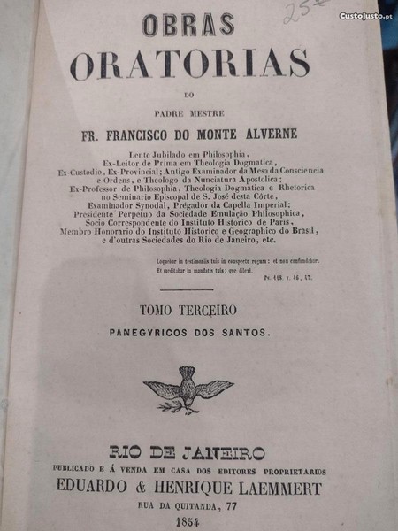 Preço: 25 €Obras Oratorias Pe Mestre Fr, Francisco do Monte Alverne 1854