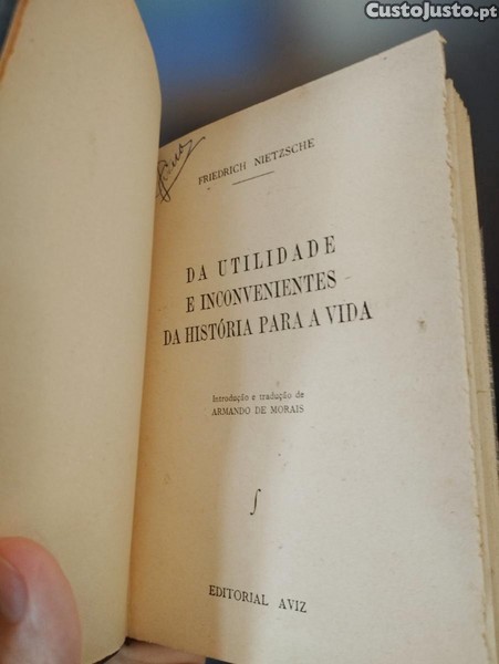SINOPSE: "A presente obra foi publicada em 1874, a segunda das quatro «Considerações Intempestivas também conhecida como «Considerações Extemporâneas, «Da Utilidade e Inconvenientes da História Para a Vida foi definida pelo autor na sua autobiografia «Ecce homo, como sendo o tratado que, através da nossa capacidade de perceber e dar significado ao passado, "traz à luz o que há de perigoso, corrosivo e envenenador na vida". E continua: "A vida doente dessa engrenagem e mecanismo desumanos, da impessoalidade do trabalhador, da falsa economia da divisão do trabalho".