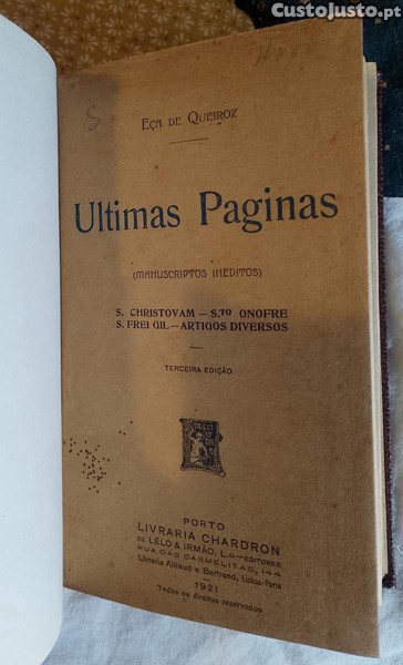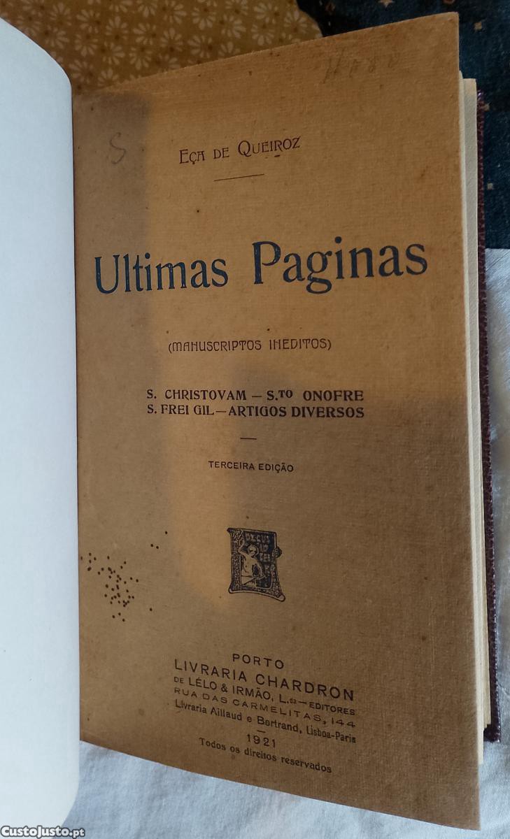 Últimas páginas, Eça de Queiroz, Livraria Chardron de Lello & Irmão, Lda. Editores, 1921, 386 páginas. Com assinatura de posse; encadernação mantém as capas de brochura; pontos de acidez aqui e além nas folhas. Em bom estado geral.