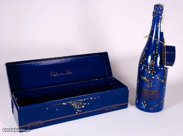 Garrafa de champanhe Taittinger Millesime 83 Garrafa decorada pelo artista Vieira da Silva, apresentada na sua caixa de origem. como nova , ainda embalada no papel de oferta a Caixa e a Garrafa estão assinadas pela artista (supunho que serigrafadas) Vieira da Silva, Taittinger Collection, Técnica Mista Sobre Plástico, 1983. São 14 as garrafas de champanhe da Colecção Taittinger projetadas como se de telas se tratassem. Uma colecção de luxo, no conteúdo e na garrafa , que funde no vidro arte moderna com gourmandise. Apaixonado pelas escolas modernas de pintura e escultura, o detentor da marca francesa Claude Taittinger sonhou uma colecção de arte de garrafas de champanhe para as suas melhores reservas, concebidas por artistas contemporâneos heterógenos. Ampliando o seu próprio repertório, os artistas abraçaram o projecto comercial: a concepção do invólucro, da caixa e um conjunto de copos para celebrar as melhores colheitas do Brut Millésimé e uma visão artística do mundo. Uma garrafa por artista, a colecção inclui uma linguagem estilística abrangente, desde a op-art de Victor Vasarely e os pontos ben-day de Roy Lichtenstein, ao surrealismo de André Masson ou à justaposição de Robert Rauschenberg, entre outros. Em 1983, Maria Elena Vieira da Silva inspirada pela sua obra Paris, la nuit, celebrou a sua abstração a azul, na concepção da sua garrafa. Conjunto de Coleção e raro nestas condições não inclui transporte