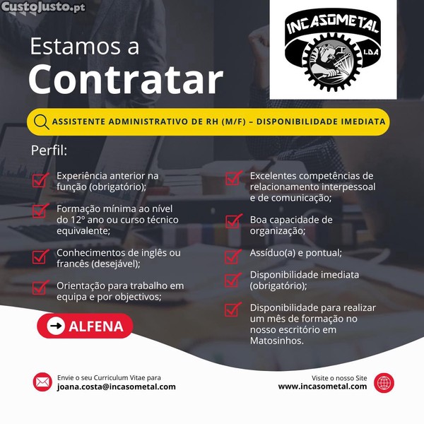 A empresa Incasometal Lda. Pretende recrutar ASSISTENTE ADMINISTRATIVO DE RH (M/F) - DISPONIBILIDADE IMEDIATA para ALFENA.