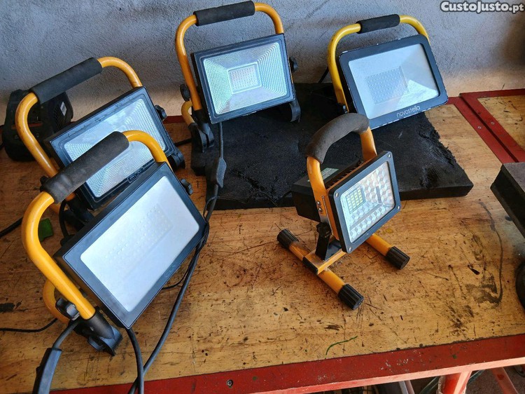 Conjunto de holofotes portáteis em bom estado de conservação. Estes holofotes são ideais para iluminação de espaços de trabalho, construção ou até mesmo eventos, com cabos e suportes ajustáveis. Uma ótima opção para quem precisa de iluminação extra e portátil no dia a dia.