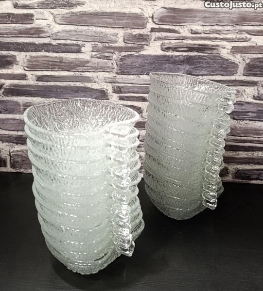 Em vidro grosso, de alta resistência, e de excelente qualidade, tanto que podem ir à máquina de lavar loiça, que não mancham, nem perdem o brilho, ou formam riscos .