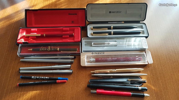 Vendo várias esferográficas em muito bom estado e a funcionar. Do lado esquerdo e de cima para baixo: Rowenta em caixa 10 Er.;Sea Horse em caixa 10 Er.; Cross 15Er.; Waterman 15 Er.; 2 Wateran (1 preta outra vermelha) e respetivas cargas 30 Er.. Lado direito de cima para baixo: Esferográfica Senator em caixa 15 Er.; Parker em caixa 5 Er.; Parker em caixa 5 Er. esferográfica dourada 5 Er.; esferográfica prateada 5 Er.; esferográfica no invólucro cujo nome não decifro 7,5 Er.; as duas últimas 5 Er. cada uma.