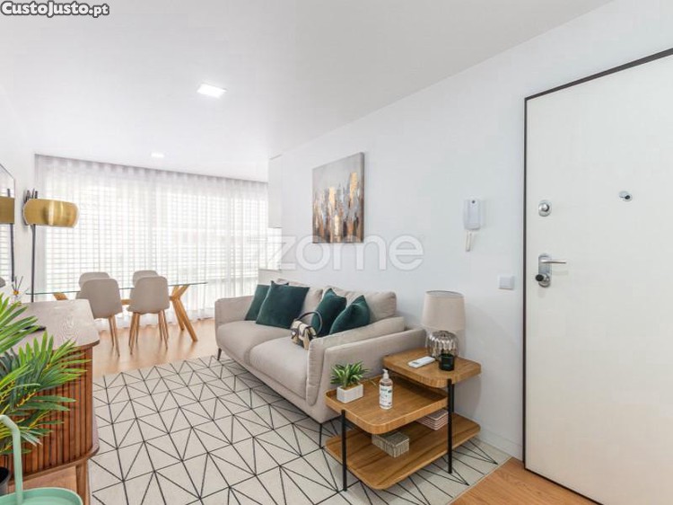 Acesso direto à sala de estar com TV, cozinha, ao corredor que dá acesso ás casas de banho e aos quartos.