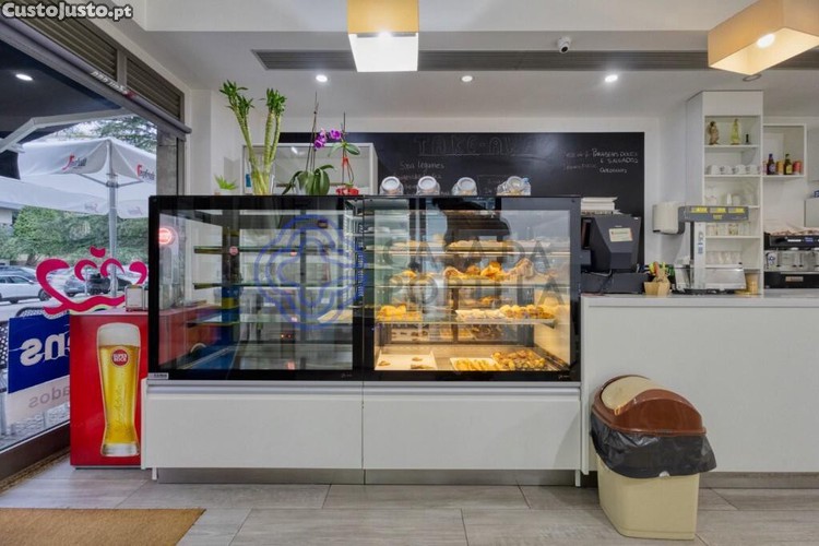 - Balcão a todo o comprimento da sala com vitrinas - montra para bebidas, bolos, portas arcas frigoríficas equipado e mobilado com bancadas em inox;