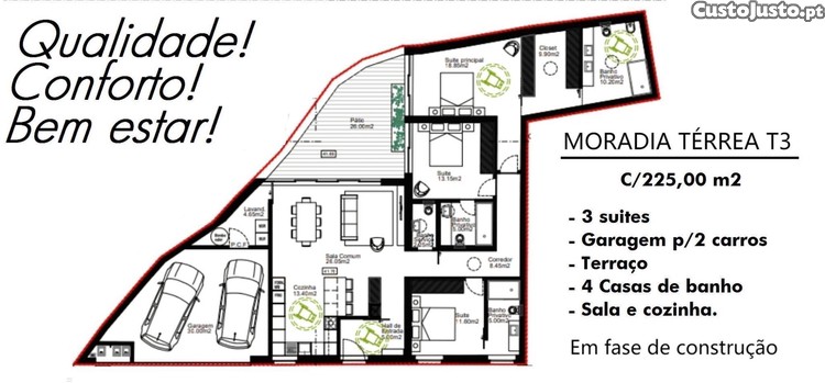 - 3 Quartos suites / 4 Casas de banho / Sala + Cozinha em openspace / Garagem p/2 carros.
