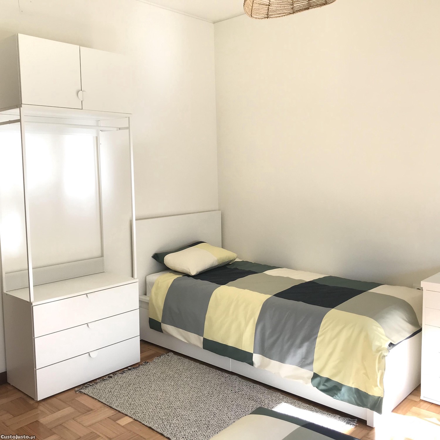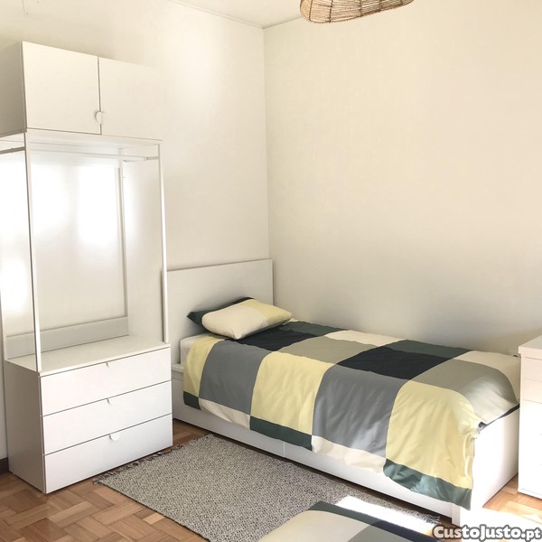 Quarto com duas camas individuais; com orientação solar a sul, para arrendamento mensal, tem 13 m, e está inserido num apartamento T3 mobilado e todo equipado, completamente renovado com materiais a estrear.