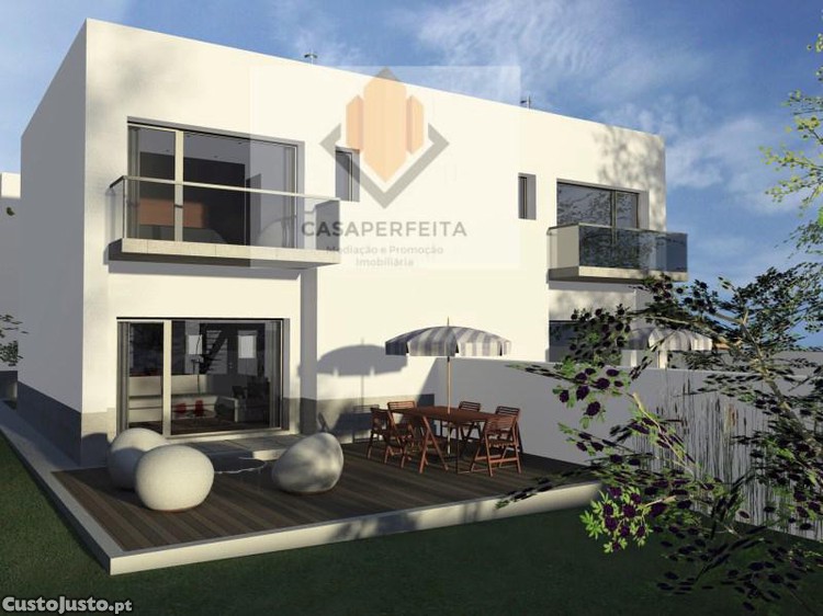 Terreno com projeto para construção de Moradia de 3 Frentes com apenas 2 pisos, garagem e espaço exterior.