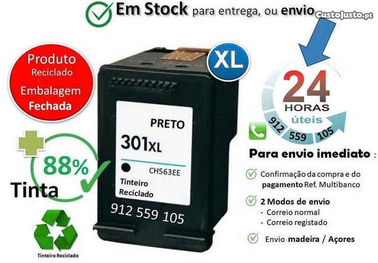 Preço: 11 €Tinteiro HP reciclado Nº 301XL Preto + 88% tinta