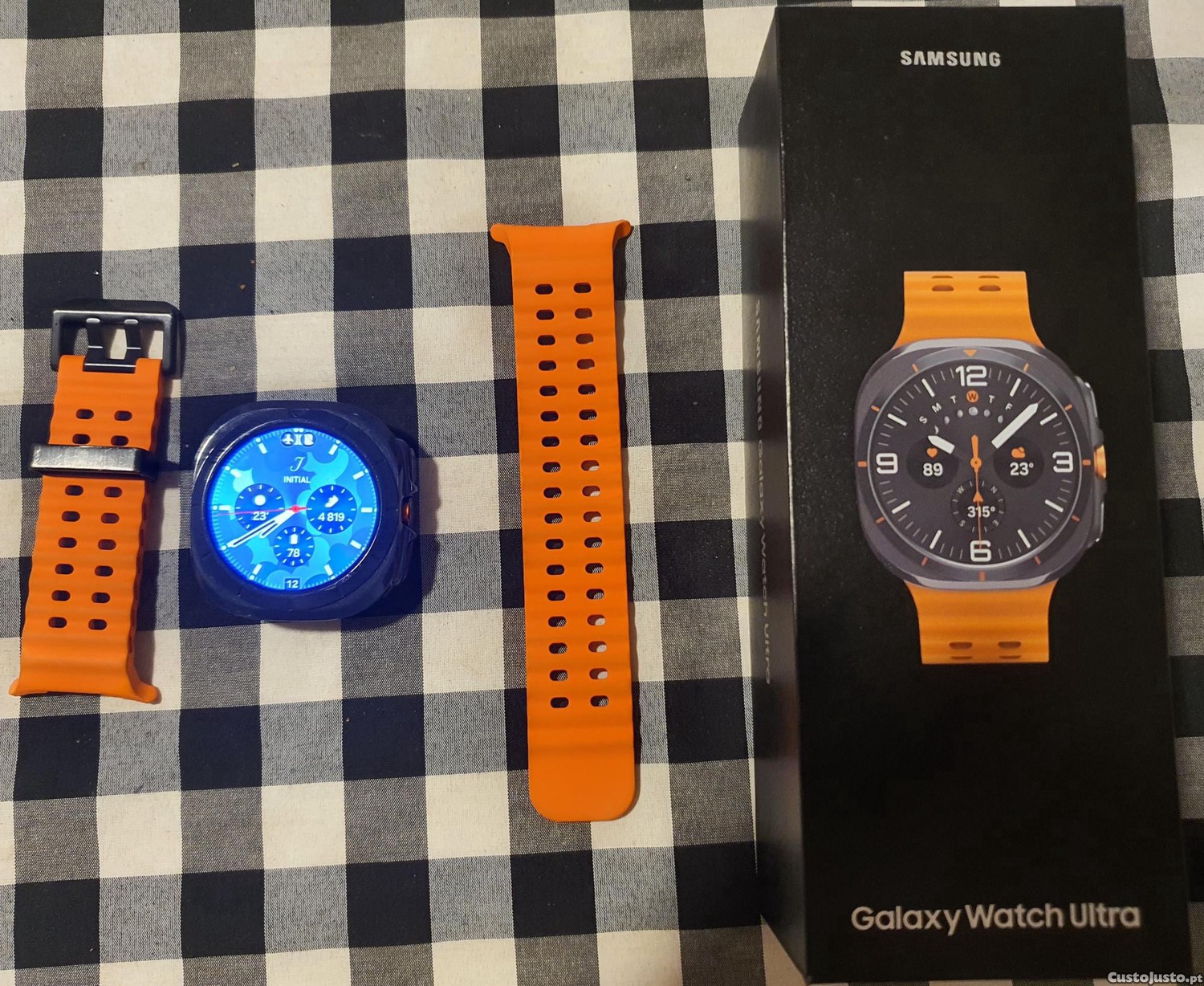 Vendo o relógio Samsung Galaxy Watch Ultra, modelo de 2024, a funcionar sem problemas, sem riscos, com uma proteção integral da caixa e ecrã. Comprado em 13/09/2024, com a fatura de compra.
