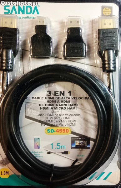 * 3 em 1: HDMI-HDMI; HDMI-Mini HDMI; HDMI-micro HDMI