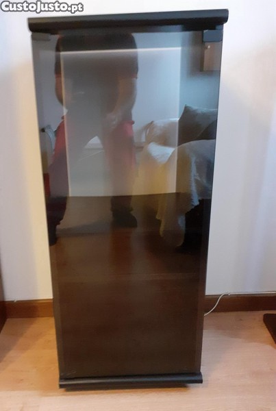 Com porta em vidro escurecido e 4 rodinhas para o mover.