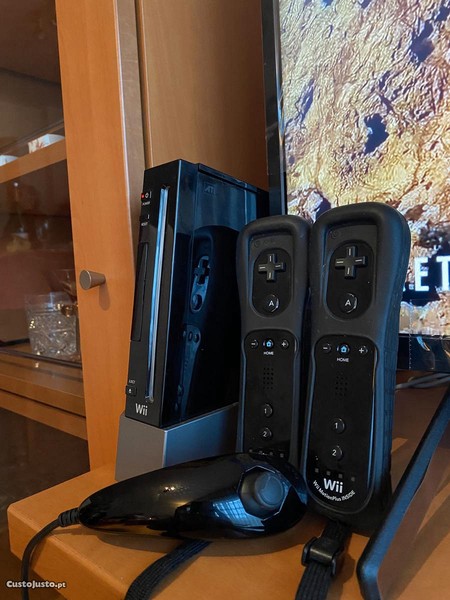 Vendo consola nitendo Wii preta, com os 3 comandos e livro de instrução. Tem algum uso, mas encontra-se em ótimo estado e funcionamento. Juntamente vendo três jogos, "Just Dance" de 2014 e 2015 e "Wii Sports Resort".