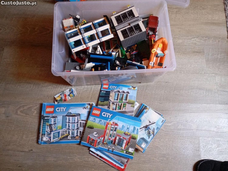 Caixa com vários tipos de Legos. Inclui esquadra da polícia, quartel de bombeiros, banco, gelataria, automóveis, ...