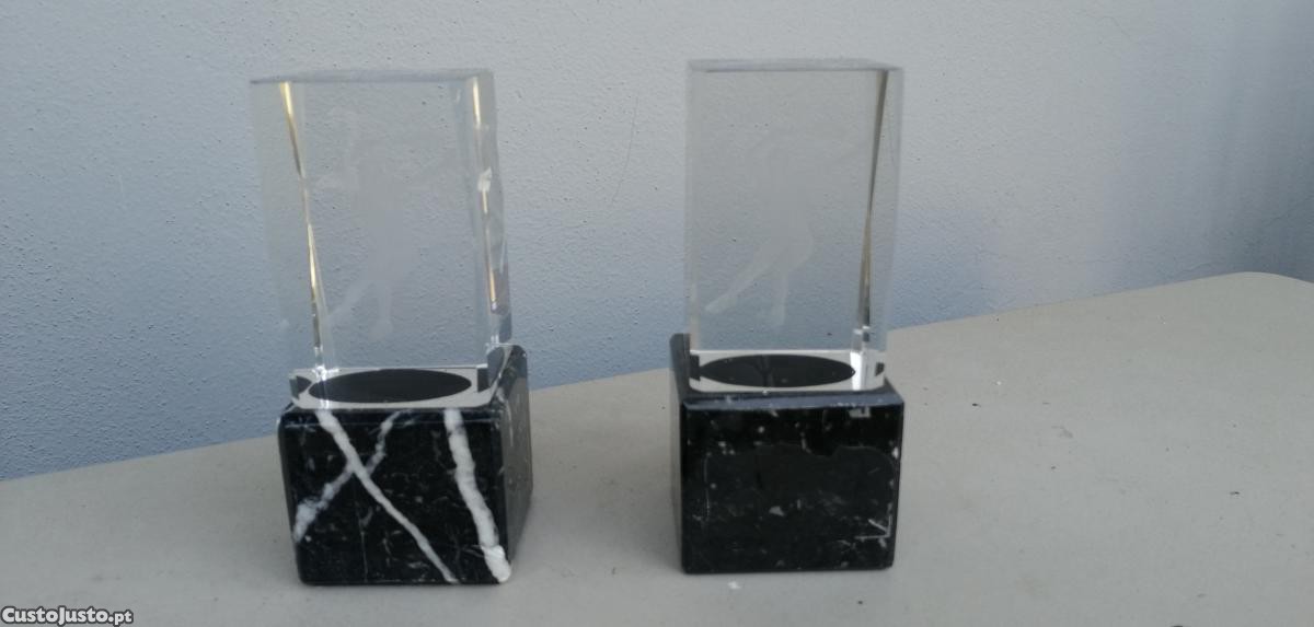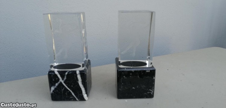 Estatuetas pesadas iguais com figura interior em três dimensões de tenista. Pode ser utilizadas como pisa papéis. Estado conforme fotos. Dimensões 5.5x 12.5 cm.