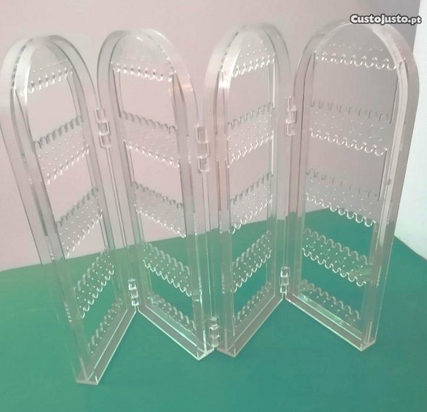 Expositor em plástico para joias, com quatro painéis, em estado de novo, com a altura de 27cm e a largura de 10,5cm, quando fechado.