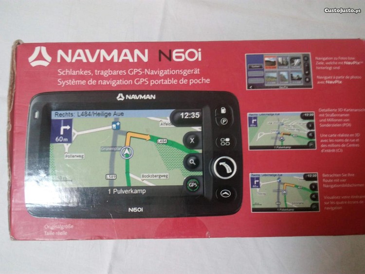 GPS em estado de usado. Não foi actualizado. Não "fala" português. Idiomas : Dinamarca, Alemanha, Inglesa, Espanhol, Francês, Italiano, Holandês e Sueco. Mapas da Europa. Bolsa de protecção com muito uso.