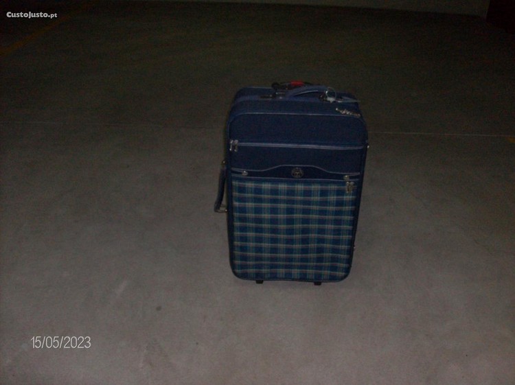 Mala em tons verdes e azuis, com 28 x 45 x 72 cm, com rodas em bom estado