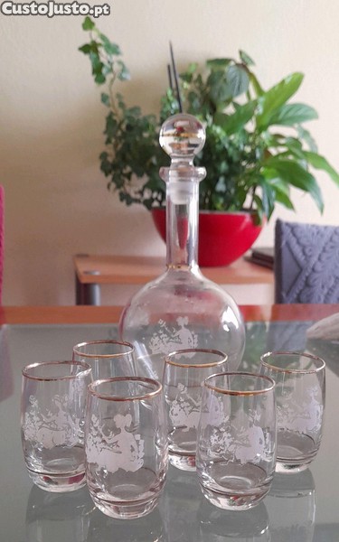 serviço de vinho fino com 6 copos e garrafa com beira dourada nunca foi usado