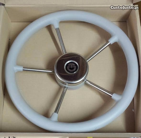 Volante em aço inox com cinco raios para consola de barco. Cumpre as regras europeias de conformidade para a náutica de recreio. Novo.