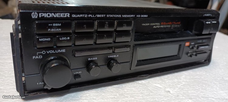 Autoradio Pioneer anos 90 . Está a funcionar bem, com o cristal de dígitos completo e iluminação do frontal cor ambar. Leitor de cassetes necessita correia.