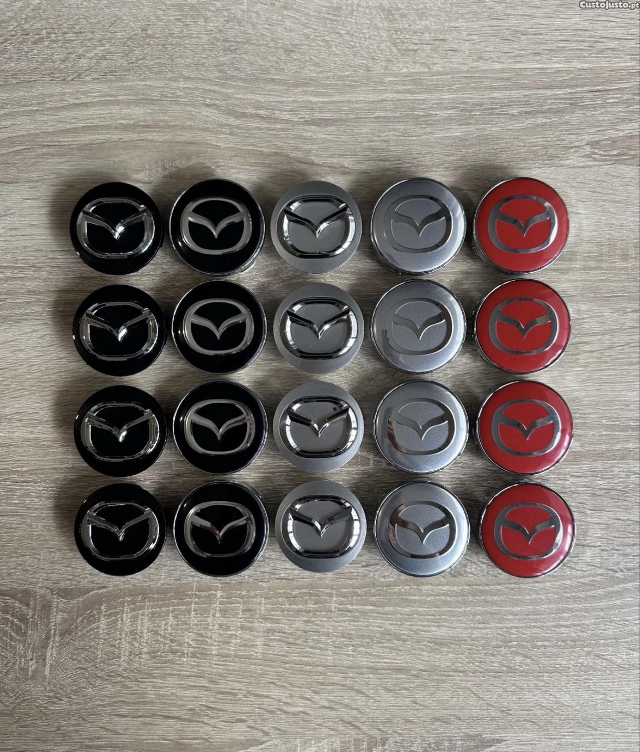 Conjunto de 4 tampas centros de jantes Mazda disponível nas medidas exteriores de centros em 56mm, 60mm, 65mm, 68mm e 75mm novos embalados no plástico.