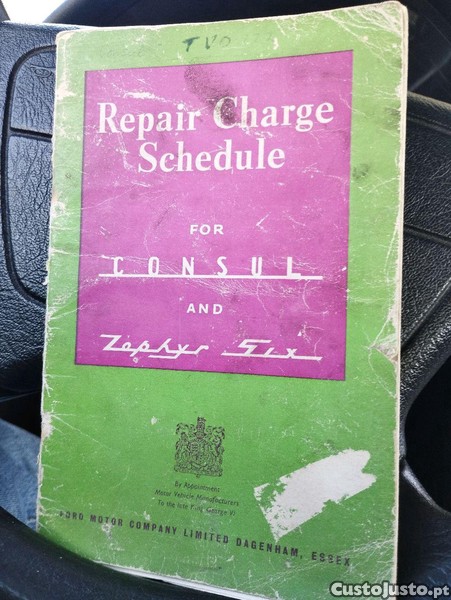 livro de indicações de manutenção dos carros Consul e Zephyr Six em Inglês com 19 páginas