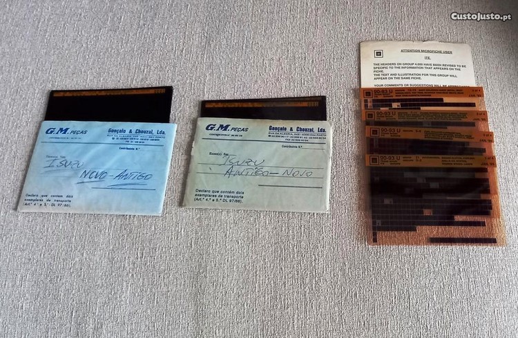 Conjunto com 36 microfichas da Isuzu, com a conversão da numeração das peças e acessórios que ocorreu nos anos de 88,89,90,91 e 2001. Conforme envelopes em que se encontram guardadas, pertenceram a empresa que comercializava peças da General Motors, onde se incluía a marca Isuzu, e que ainda se encontra a laborar no Porto.