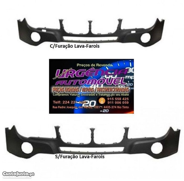 desde 145eur cada parachoques para-choques frente novo bmw x3 e83 com/sem furo lava-farois 2006 2007 2008 2009 2010 valor unitário. temos um vasto stock de peças novas e usadas para todas as marcas automoveis. enviamos para continente e ilhas. envios após pagamento; acrescem portes de envio. todos os anúncios são publicados por rotina informática, estando a disponibilidade sempre sujeita a confirmação. poderá adquirir o material no nosso armazém em gondomar - porto ou solicitar a entrega na morada que pretender. será importante pedir a confirmaçao/separação da peça que pretende antes de se deslocar ao armazém, de modo a evitar o tempo de espera. obrigado, urgência automóvel