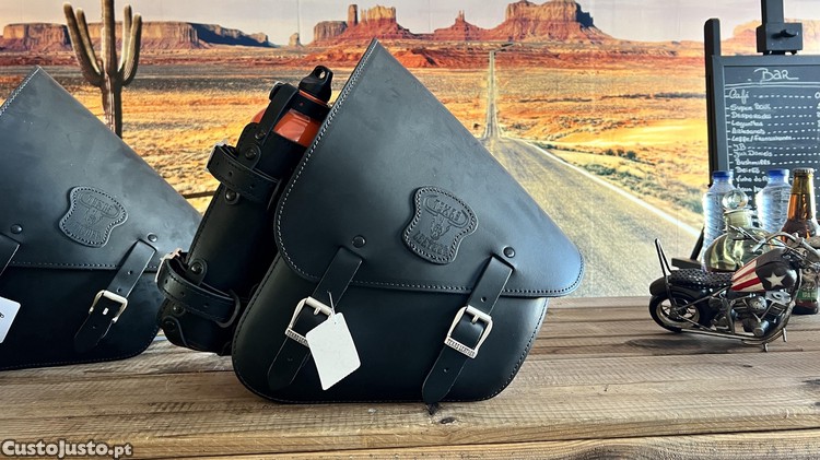 Preço: 279 €Alforge com garrafa mais suporte em pele chopper Harley shadow Dragstar