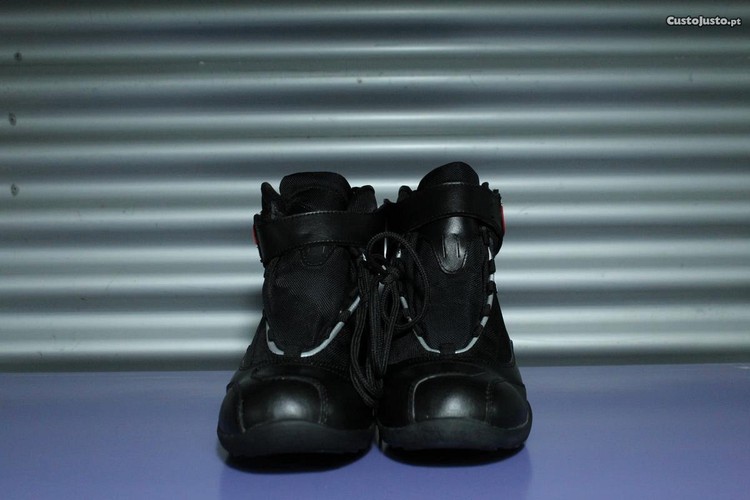 Interior em microfibra, solo em borracha, à prova de água, proteção da biqueira, calcanhar e tornozelo externo, fecho em velcro.